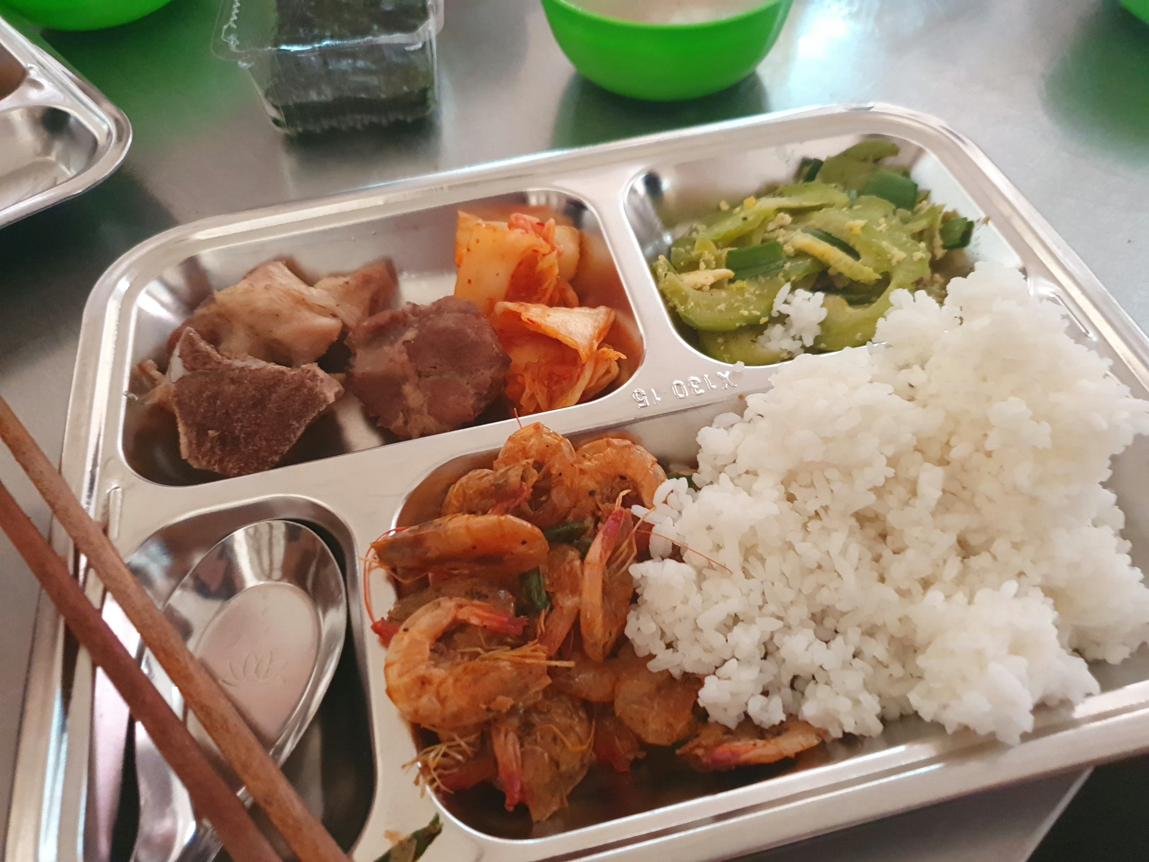 16 giờ 30, tiếng loa lại vang lên báo đến giờ ăn cơm chiều. (Giờ ăn uống dường như trùng khung giờ sinh hoạt tại Hàn Quốc). Chúng tôi cũng vô cùng bất ngờ với những bữa cơm ngon miền Tây hàng ngày. Thực đơn mỗi ngày đều thay đổi nên rất ngon miệng.