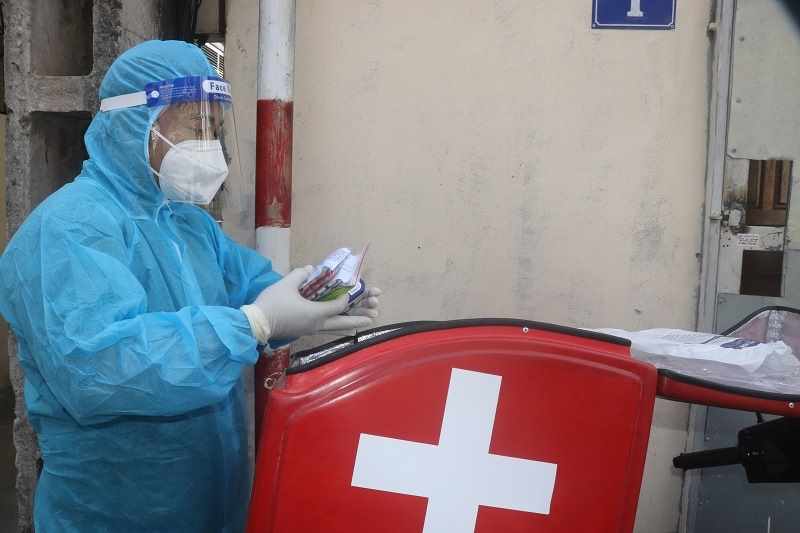 Nhân viên y tế Hà Nội mang thuốc đến cho bệnh nhân F0 điều trị tại nhà. Ảnh: Báo Kinh tế Đô thị