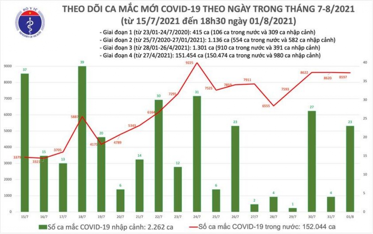 Tính đến chiều 1/8, Việt Nam có 154.306 ca mắc trong đó có 2.262 ca nhập cảnh và 152.044 ca mắc trong nước. Số ca mắc mới ghi nhận trong nước tính của đợt dịch kể từ 27/4 đến nay là 150.474, trong đó có 40.383 bệnh nhân đã được công bố khỏi bệnh. Hiện có 4/62 tỉnh, thành phố đã qua 14 ngày không ghi nhận trường hợp mắc mới: Yên Bái, Điện Biên, Quảng Ninh và Bắc Kạn. 9 tỉnh, thành phố không có lây nhiễm thứ phát trên địa bàn: Lào Cai, Ninh Bình, Kon Tum, Hà Giang, Sơn La, Lai Châu, Tuyên Quang, Quảng Trị và Nam Định.