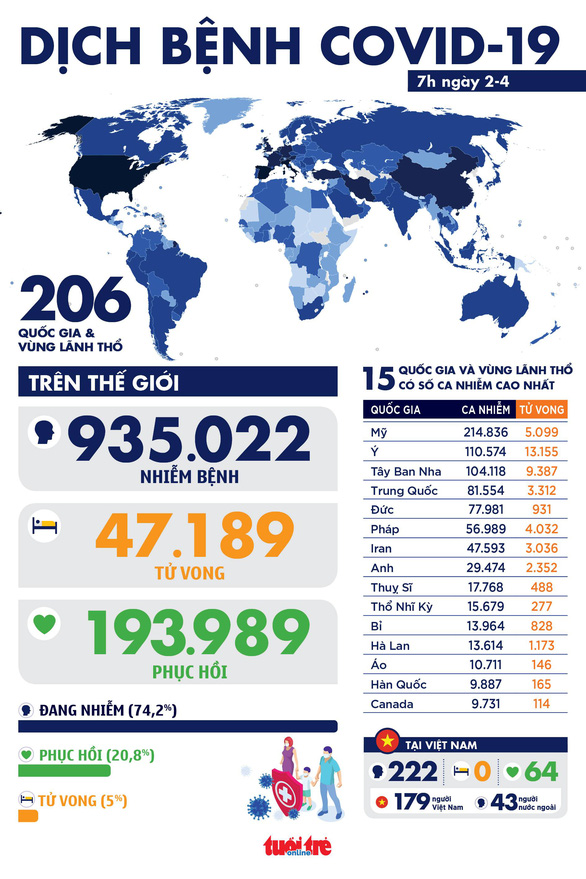 Ngày 02/04, Châu Âu và Mỹ tiếp tục là điểm nóng Covid-19 của thế giới. Hiện số ca mắc Covid-19 toàn cầu đã lên tới hơn 930.000, với gần 47.000 ca tử vong tại 205 quốc gia và vùng lãnh thổ. Như vậy, chỉ trong 24h, số ca mắc và tử vong do virus SARS-CoV-2 trên thế giới đã tăng lần lượt là hơn 79.0 và 4.800 ca so.