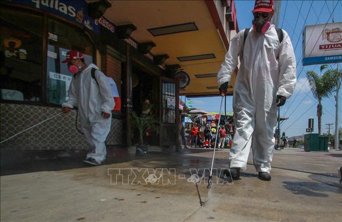 Ảnh: Công nhân phun thuốc khử trùng tại Tijuana, Mexico. (Ảnh: THX/TTXVN) |