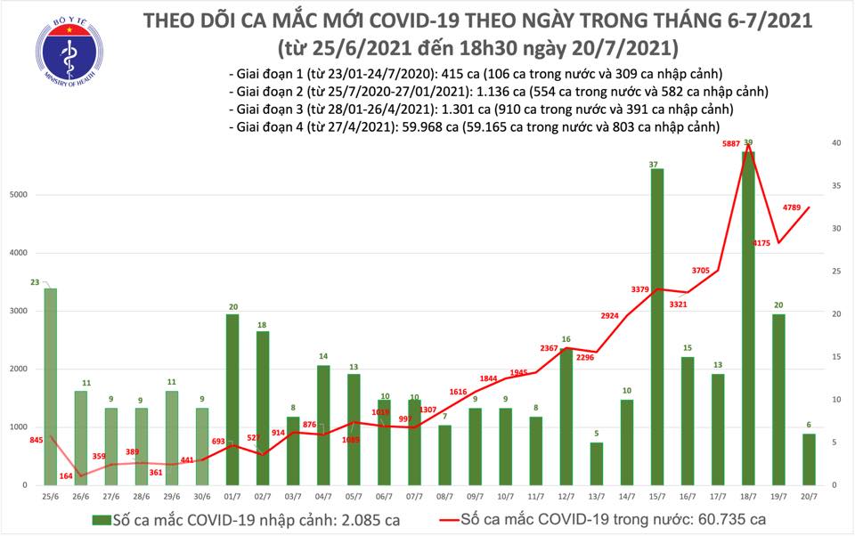 Tính từ 6h đến 18h ngày 20/7, Việt Nam ghi nhận thêm 2.640 ca mắc COVID-19, nâng tổng số mắc trong ngày lên 4.795 ca. Trong đó có 06 ca nhập cảnh và 4.789 ca ghi nhận trong nước tại Thành phố Hồ Chí Minh (3.322 ca), Bình Dương (578 ca), Hà Nội (46 ca)… Đến nay, Việt Nam ghi nhận 62.820 ca mắc COVID-19.
