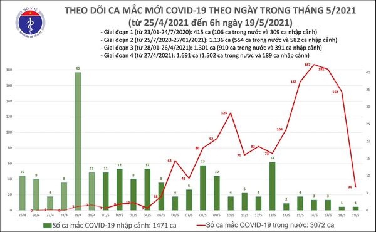 Bộ Y tế cho biết, trong số 30 ca mắc trong nước có 8 ca ghi nhận trong khu cách ly và 22 ca trong khu vực được phong tỏa. Tính đến 6h ngày 19/5, Việt Nam có tổng cộng 3.072 ca ghi nhận trong nước và 1.471 ca nhập cảnh. Số ca mắc mới tính từ ngày 27/4 đến nay là 1.502 người.