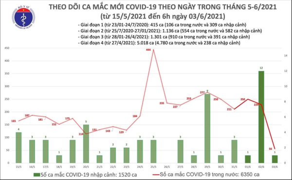 Tính đến 6h ngày 3/6, Việt Nam có tổng cộng 6.350 ca ghi nhận trong nước và 1.520 ca nhập cảnh. Số ca mắc mới tính từ ngày 27/4 đến nay là 4.780 người.