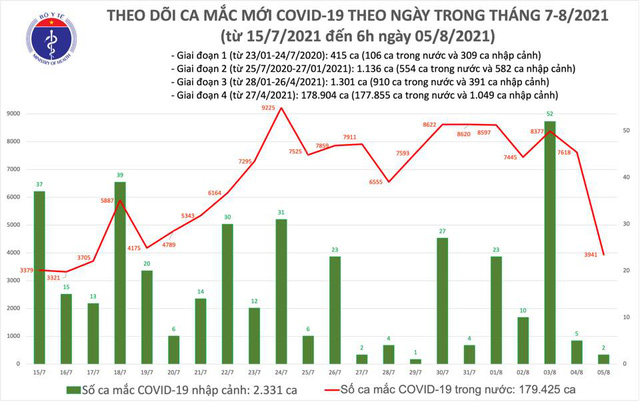 (VOV5) - Tính từ 18h30 ngày 04/8 đến 6h ngày 05/8 trên Hệ thống Quốc gia quản lý ca bệnh covid 19 ghi nhận 3.943 ca nhiễm mới, trong đó 02 ca nhập cảnh và 3.941 ca ghi nhận trong nước (giảm 326 ca so với sáng hôm qua) tại TP. Hồ Chí Minh (2.349), Bình Dương (497); Tây Ninh (235), Long An (189), Tiền Giang (169), Đồng Nai (110), Đà Nẵng (92), Bà Rịa - Vũng Tàu (66), Vĩnh Long (58), Bình Định (35), Đồng Tháp (32), An Giang (21), Sóc Trăng (20), Phú Yên (17), Kiên Giang (12), Đắk Lắk (9), Quảng Bình (9), Trà Vinh (9), Bạc Liêu (6), Lạng Sơn (2), Thanh Hóa (1), Lâm Đồng (1), Quảng Trị (1), Hà Tĩnh (1) trong đó có 1.008 ca trong cộng đồng.