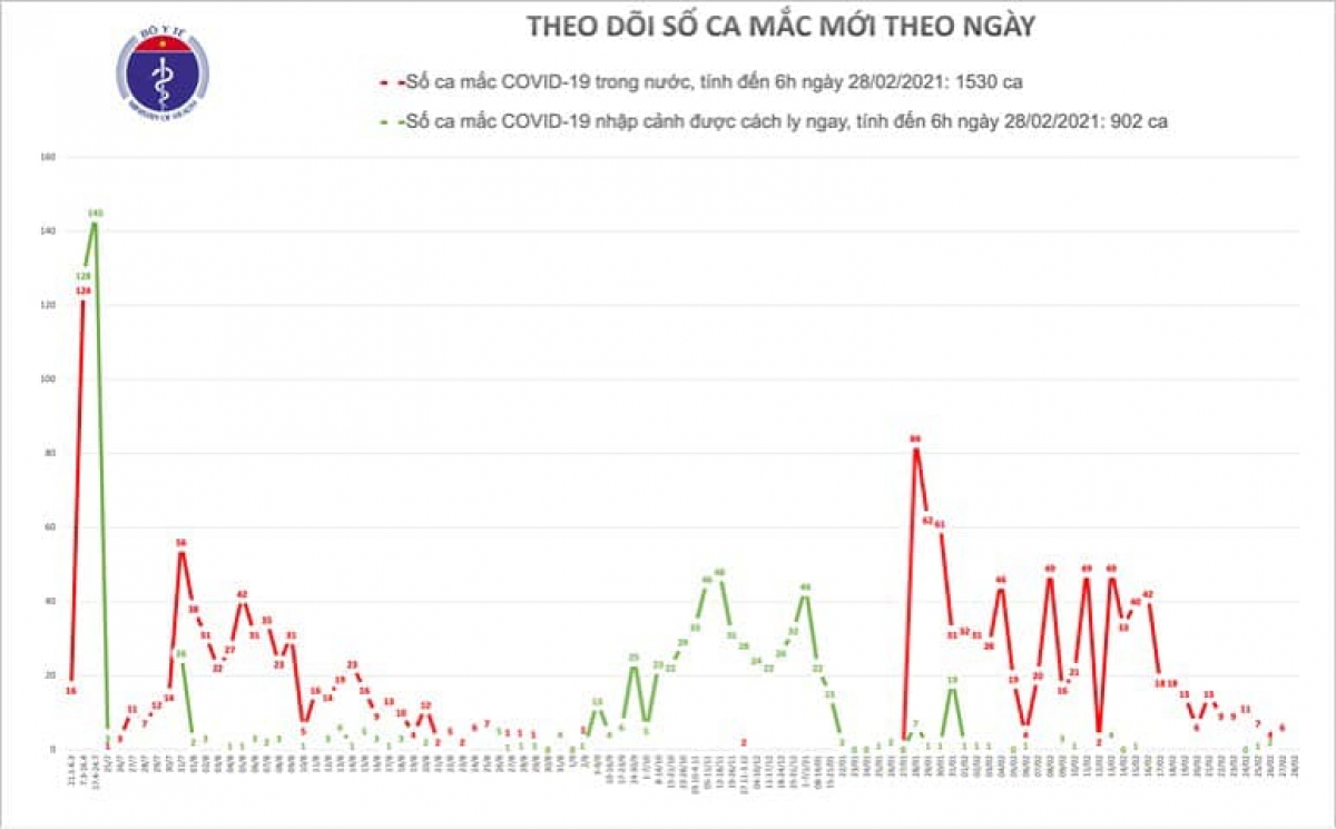 Tính đến 6h ngày 28/2, Việt Nam có tổng cộng 1530 ca mắc COVID-19 do lây nhiễm trong nước, trong đó số lượng ca mắc mới tính từ ngày 27/1 đến nay: 837 ca.