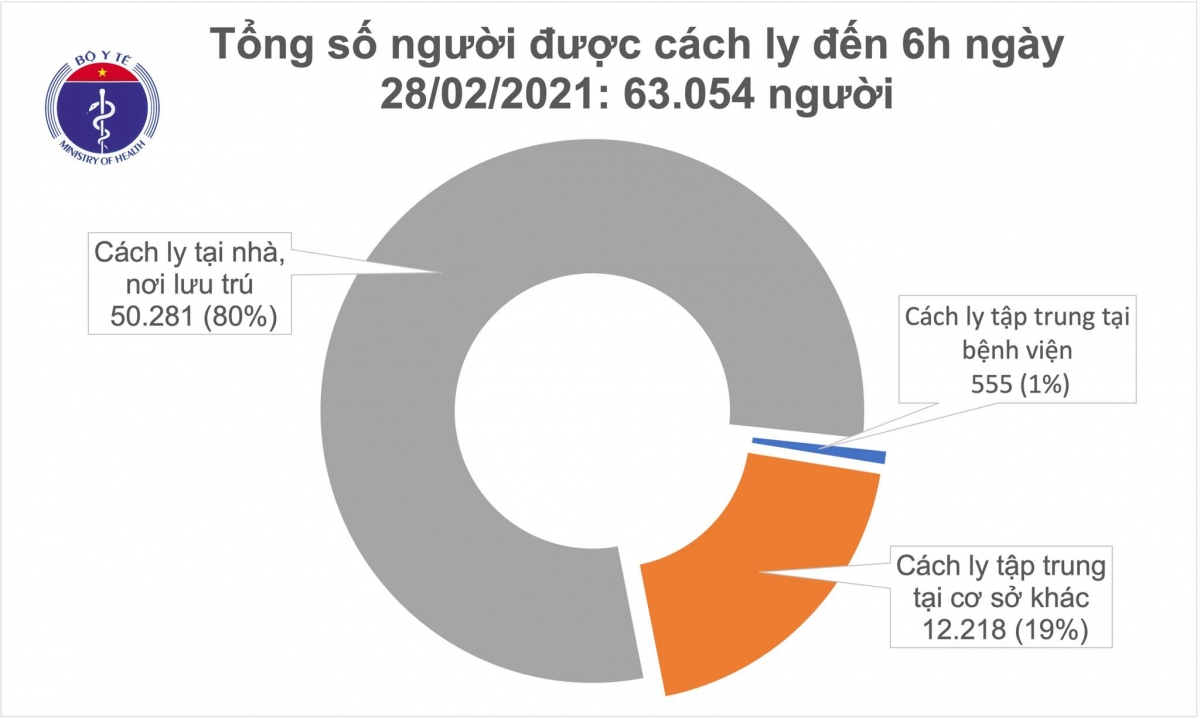 Tổng số người tiếp xúc gần và nhập cảnh từ vùng dịch đang được theo dõi sức khỏe (cách ly): 63.054, trong đó: