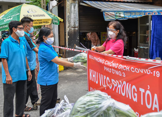Cán bộ Liên đoàn lao động quận Tân Bình, Thành phố Hồ Chí Minh tặng rau, củ quả cho công nhân các khu vực bị phong tỏa; Ảnh: TL/nld. |