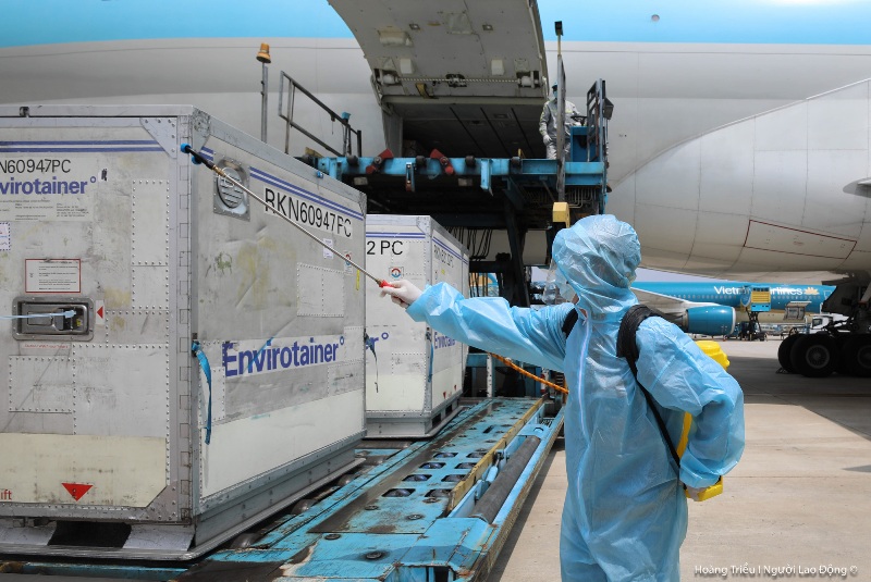 Một lô vắc-xin ngừa Covid-19 về đến sân bay Tân Sơn Nhất - Ảnh: Hoàng Triều/nld.com.vn |