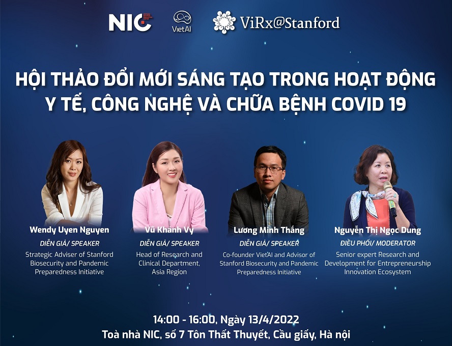 Ngày 13/4, Trung tâm Đổi mới sáng tạo quốc gia, Bộ Kế hoạch đầu tư và Viện Vi sinh và Chống dịch Stanford (Hoa Kỳ) tổ chức Tọa đàm “Đổi mới sáng tạo trong hoạt động y tế, công nghệ và chữa bệnh COVID-19”. Cuộc tọa đàm nhằm cung cấp những thông tin mới nhất về ứng dụng công nghệ trí tuệ nhân tạo (AI) trong việc phòng và chữa bệnh COVID-19, chia sẻ những hướng phát triển và nhu cầu tìm kiếm đối tác và giới thiệu những thành tựu trong việc sáng chế các loại thuốc chữa COVID-19.