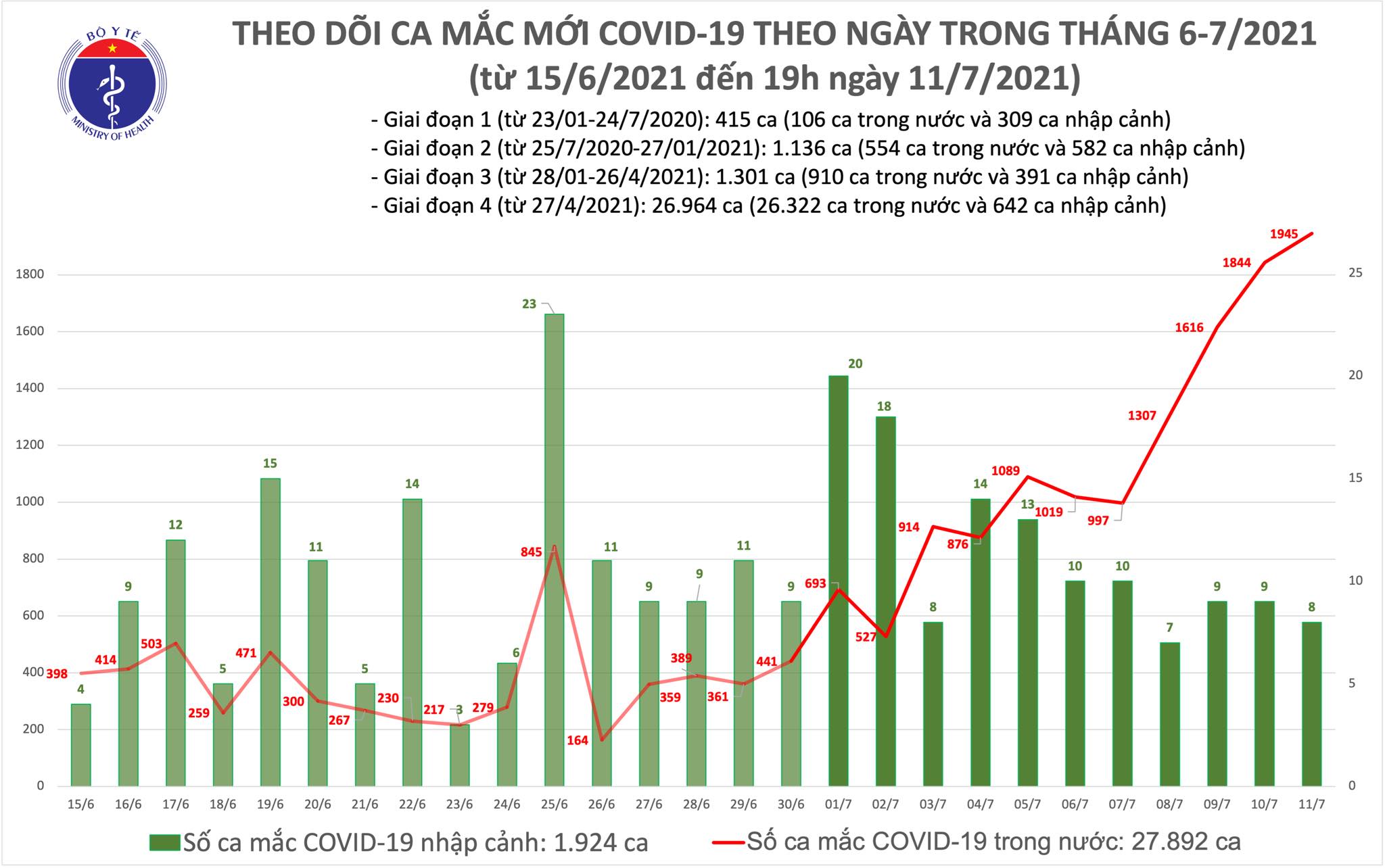 - Trong ngày 11/7, Việt Nam ghi nhận 1.953 ca mắc mới: