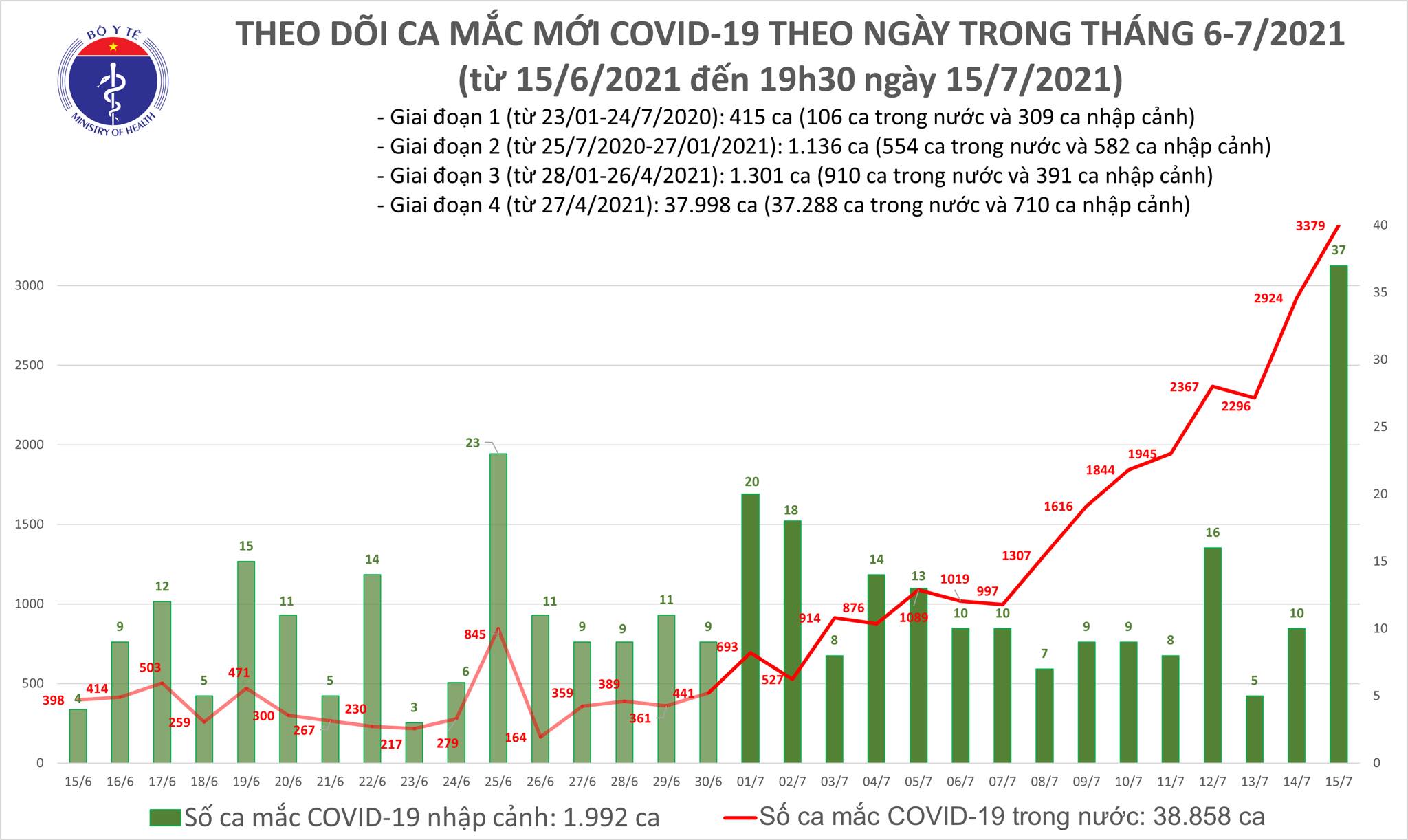 Bản tin dịch COVID-19 tối 15/7 của Bộ Y tế cho biết có thêm 1.922 ca mắc COVID-19. Trong ngày TP. Hồ Chí Minh đăng ký bổ sung 689 ca đã được phát hiện trước đó tại các khu cách ly. Tổng số mắc hôm nay là 3.416 ca. Đến nay, Việt Nam ghi nhận tổng cộng 40.850 ca bệnh.