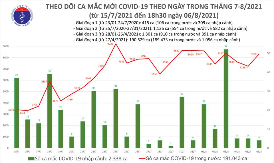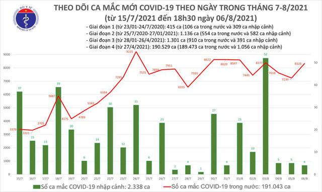 - Tính đến chiều ngày 06/8, Việt Nam có 193.381 ca nhiễm trong đó có 2.338 ca nhập cảnh và 191.043 ca mắc trong nước.