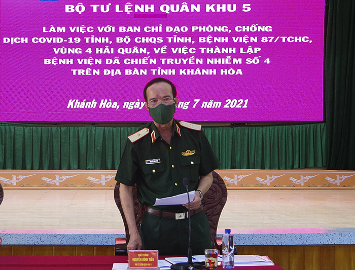 Ngày 28/7, đoàn công tác của Bộ Tư lệnh Quân khu 5 do Thiếu tướng Nguyễn Đình Tiến, Phó Tư lệnh Quân khu 5, làm việc với Sở Y tế Khánh Hòa, Ban Chỉ đạo phòng chống dịch Covid-19 của tỉnh Khánh Hoà; kiểm tra công tác chuẩn bị khẩn trương triển khai đưa Bệnh viện dã chiến truyền nhiễm Số 4 của Bộ Quốc phòng vào hoạt động, điều trị bệnh nhân Covid-19 cho bộ đội và nhân dân tỉnh Khánh Hòa và các tỉnh lân cận.