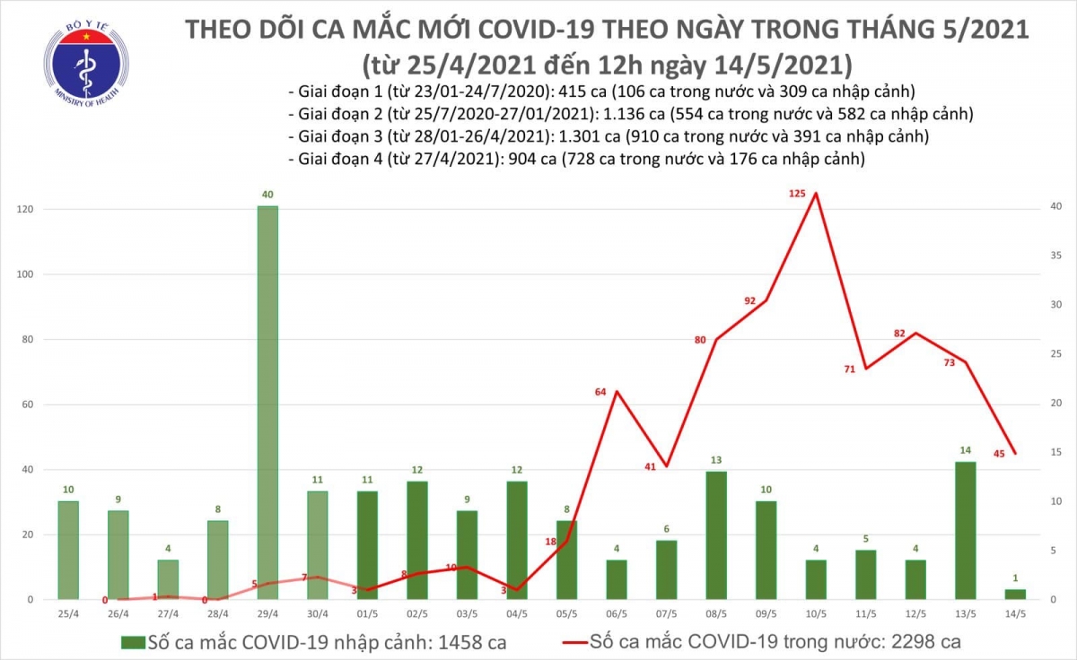 Tính đến 12h ngày 14/5, Việt Nam có tổng cộng 2.298 ca ghi nhận trong nước và 1.458 ca nhập cảnh. Số lượng ca mắc mới tính từ ngày 27/4 đến nay: 728 ca.