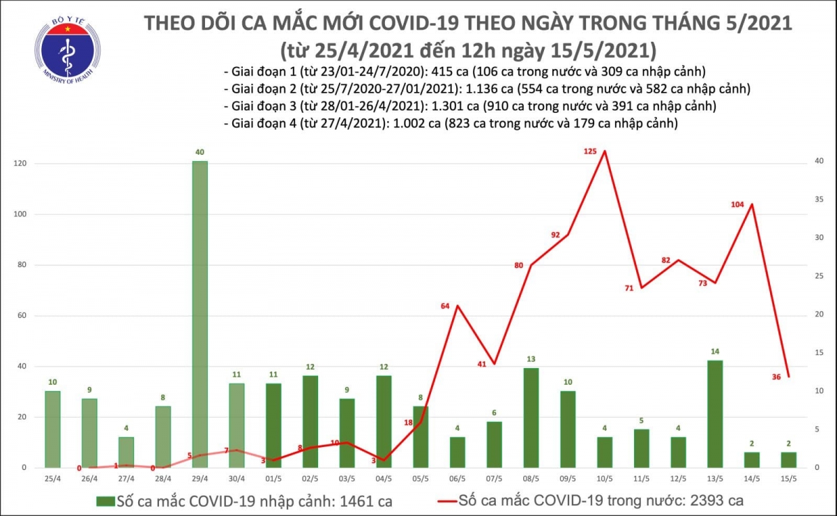 Trong đó, 16 ca mới ghi nhận trong khu vực đã được cách ly. Cả nước không phát hiện các ổ dịch mới. Tính đến 12h ngày 15/5, Việt Nam có tổng cộng 2.393 ca ghi nhận trong nước và 1.461 ca nhập cảnh. Số ca mắc mới tính từ ngày 27/4 đến nay là 823 người.