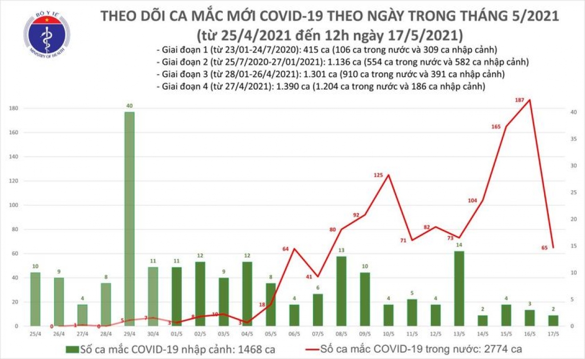 Tính đến 12h ngày 17/5, Việt Nam có tổng cộng 2.774 ca ghi nhận trong nước và 1.468 ca nhập cảnh, trong đó, số ca mắc mới tính từ ngày 27/4 đến nay là 1.204 người. Số lượng mẫu xét nghiệm từ 29/4 đến nay là 482.900 mẫu.