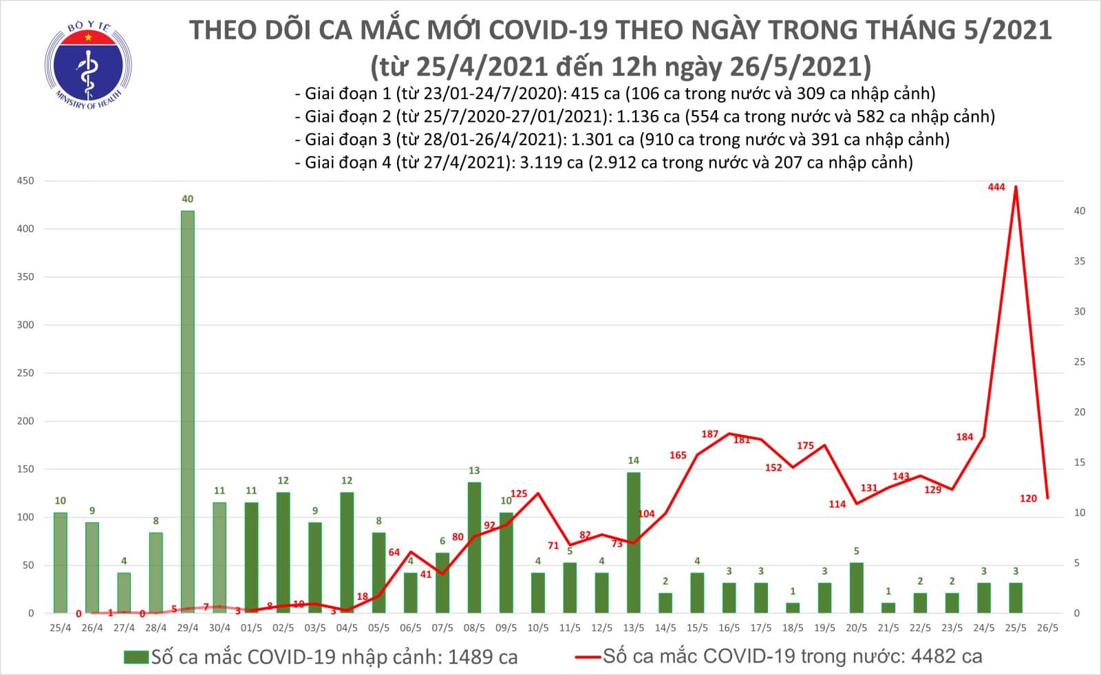 Tính từ 6h đến 12h ngày 26/05, Việt Nam có 40 ca mắc mới ghi nhận trong nước tại Bắc Giang (27), Bắc Ninh (4), Điện Biên (1), Hải Dương (1), Hà Nội (6), Bệnh viện Bệnh nhiệt đới Trung ương cơ sở Đông Anh (1).