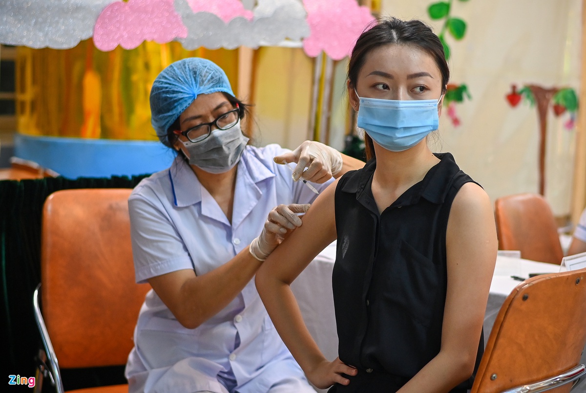 Chị Nguyễn Diệu Linh (sinh sống tại phố Nguyễn Đình Chiểu, quận Hai Bà Trưng) được tiêm vắc xin covid -19 vào sáng 28/7, tại điểm trường Mầm non 20/10, phố Thợ Nhuộm. Ảnh Việt Linh/zingnews.vn |