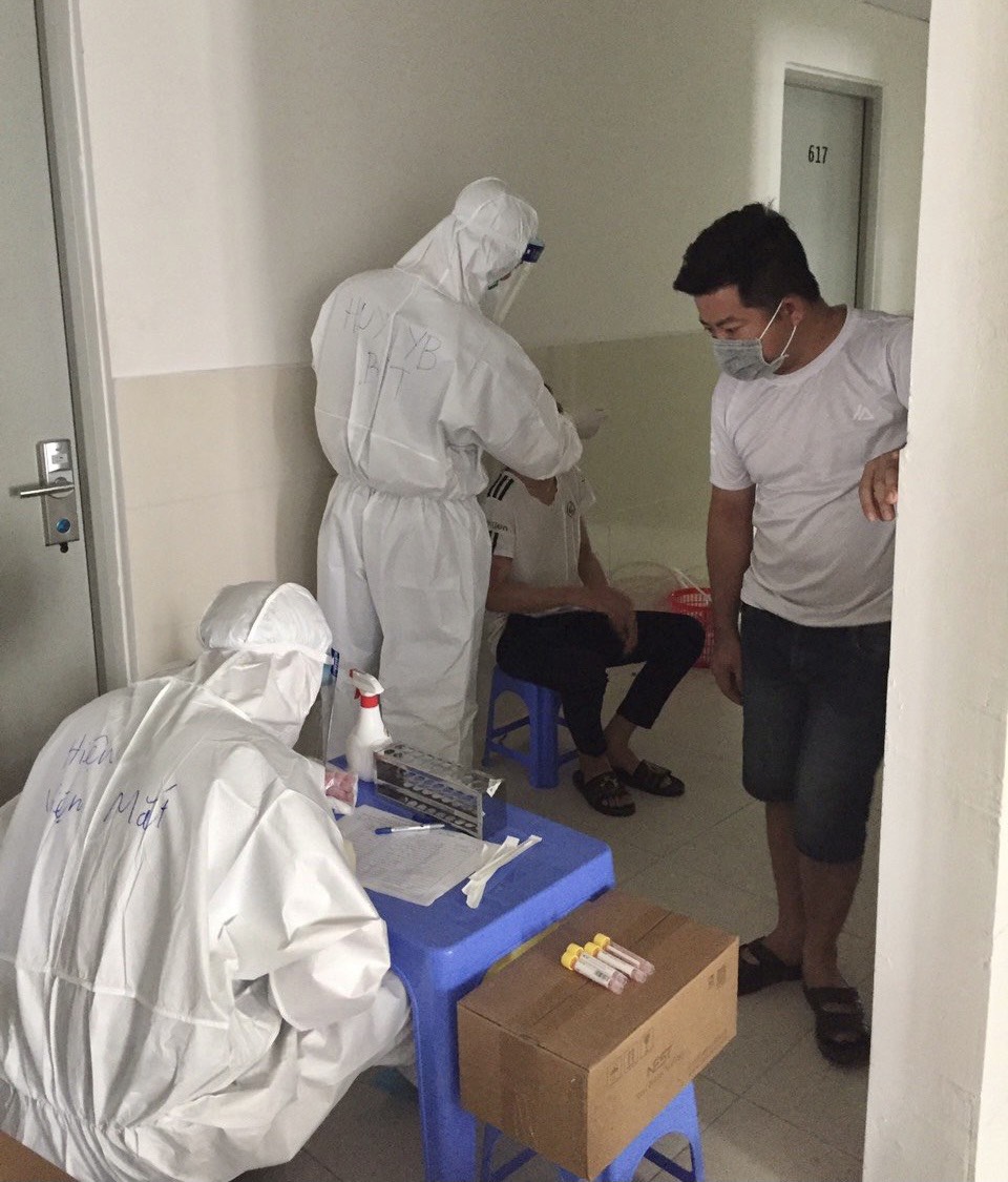 Để phòng chống dịch, các thành viên trong đoàn ai cũng mặc bảo hộ kín mít, tên ghi ngay trên áo để dễ nhận biết. Trong ảnh, bác sĩ Huy lấy mẫu xét nghiệm cho người dân Bắc Giang |