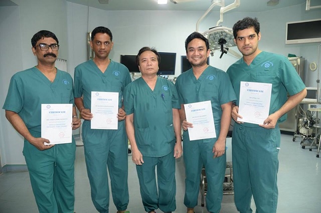 PGS, TS Trần Ngọc Lương (giữa) đã đào tạo và chuyển giao kỹ thuật mổ nội soi tuyến giáp cho nhiều bác sĩ trong và ngoài nước - Ảnh: nhandan.com.vn |