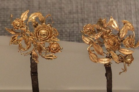 Bộ Trâm cài đầu nạm vàng và bạc thời Chúa Nguyễn thế kỷ 18 với 9 chiếc trâm cài đầu không chiếc nào giống nhau với hoa văn rồng phượng uốn lượn.