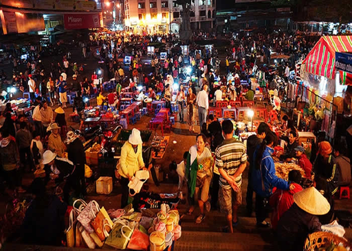 Theo con đường chính dẫn vào trung tâm thành phố, băng qua cây cầu thơ mộng của hồ Xuân Hương và cung đường Nguyễn Thị Minh Khai lấp lánh ánh đèn, hiện ra ngay trước mắt du khách là cảnh náo nhiệt của chợ đêm Đà Lạt.