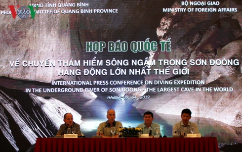 Ngày 9/4, tại Hà Nội, UBND tỉnh Quảng Bình, Bộ Ngoại giao, nhóm chuyên gia từ Hiệp hội hang động Hoàng gia Anh (BCRA) đã họp báo công bố kết quả chuyến thám hiểm sông ngầm trong hang Sơn Đoòng - hang động lớn nhất thế giới.