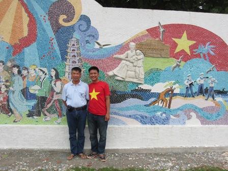 | Ông Nguyễn Huy Cường (bên trái) bên bức tranh gốm "Trường Sa trong trái tim cả nước" |