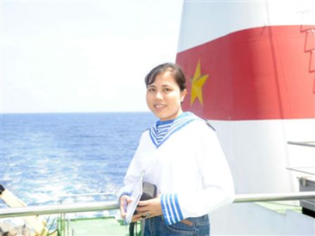 | Chị Nguyễn Thu Thủy trong chuyến hải trình ra Trường Sa |
