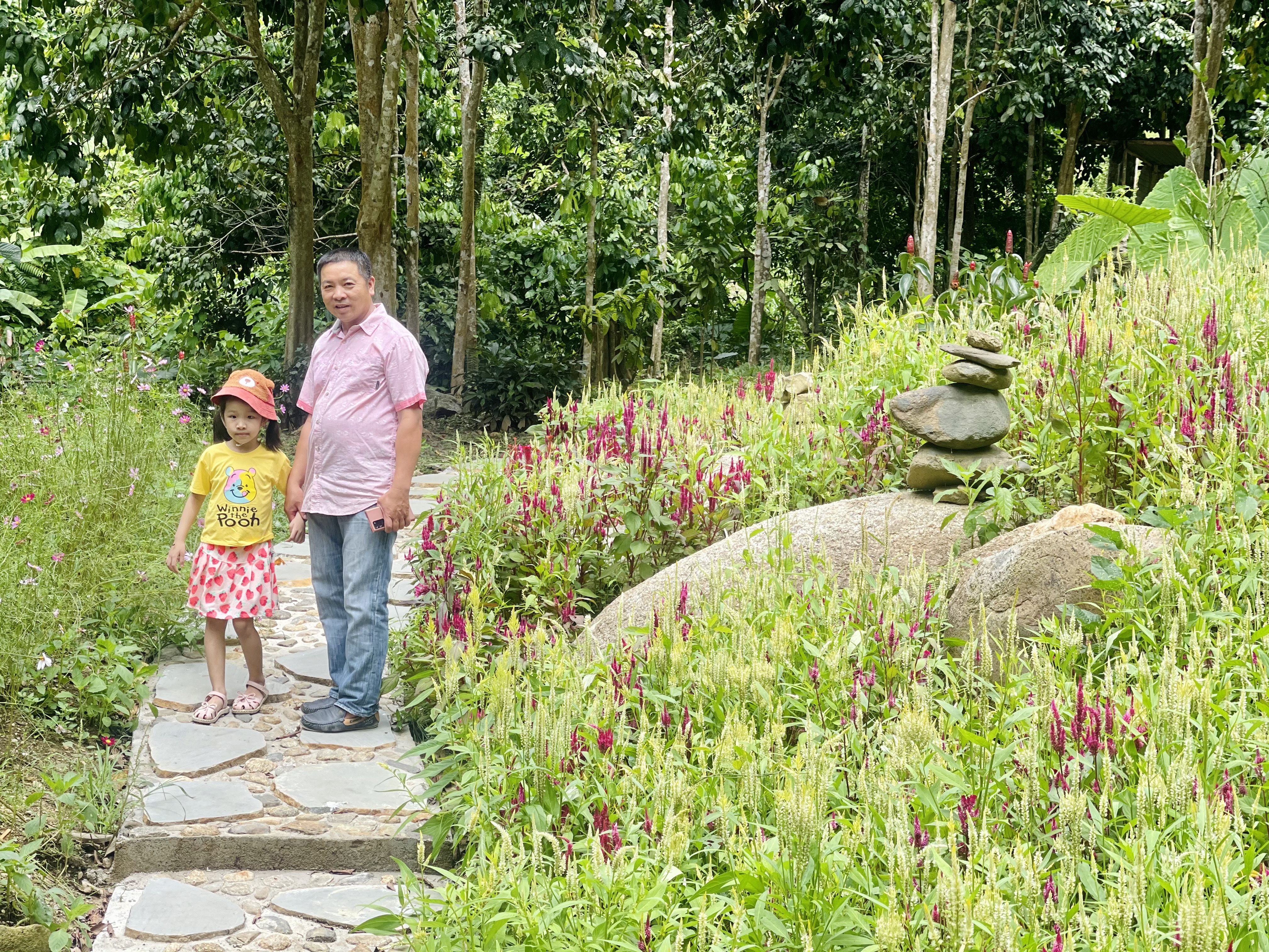 Ông Trần Văn Hà cùng một du khách nhí dạo chơi trong không gian xanh |