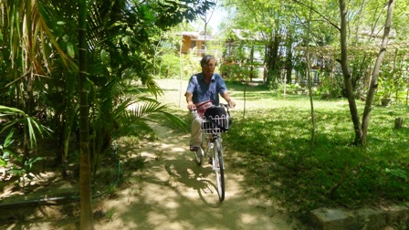 | Kiến trúc sư Bùi Kiến Quốc trên chiếc xe đạp dạo quanh làng |