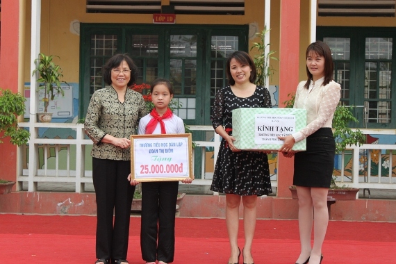 | NGƯT Nguyễn Thị Hiền và cô Hiệu Phó – Nguyễn Thị Phương trao quà cho cô và trò trường Tả Phời - Lào Cai - Ảnh: doanthidiem.edu.vn |
