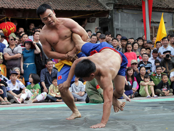 Các trận đấu luôn tạo ra không khí hào hứng, sôi nổi trong tiếng hò reo cổ vũ hòa cùng tiếng trống thúc giòn giã. Trên sới vật, từng cặp đô vật thân hình cường tráng, mình trần, chít khăn xanh, khăn đỏ đang khua chân, múa tay để rình miếng nhau, chỉ đợi đối phương sơ hở là lao vào vật ngửa đối thủ. Xung quanh sới vật, người già, trẻ em, thanh niên trai tráng cũng hồi hộp dõi theo diễn biến trận đấu và không quên vỗ tay tán thưởng những miếng vật hay, độc đáo. Những cuộc thi tài của các đô vật nhí thường được tổ chức sen kẽ giữa các cuộc đấu vật chính thức. Những trận đấu của các đô vật nhí thường nhận được những tràng vỗ tay cổ vũ, kèm theo tiếng cưới sảng khoái cho khán giả. Đô vật nhí, Nguyễn Hữu Nam năm nay 10 tuổi như rất nhiều bé trai trong làng rất mong ngóng được đến dự hội, hồ hởi nói: “Mỗi khi Tết đến có lễ hội đấu vật này cháu rất vui. Cháu đến hội vật này cùng bố cháu. Cháu cũng thi đấu, được giao lưu với các bạn khác.”