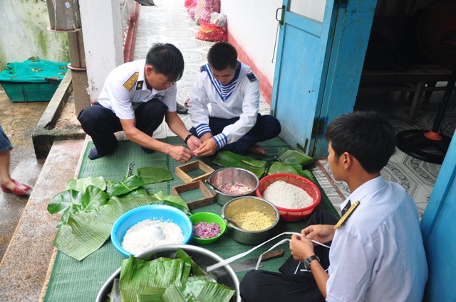 Ở đảo Nam Yết, xã Sinh Tồn, huyện Trường Sa, các cán bộ chiến sỹ tự tay gói giò và bánh chưng. Tuy đất liền gửi ra rất nhiều lá dong để gói bánh chưng, nhưng cán bộ chiến sỹ trên đảo vẫn thích gói bánh chưng bằng lá cây bàng vuông được trồng rất nhiều trên đảo.