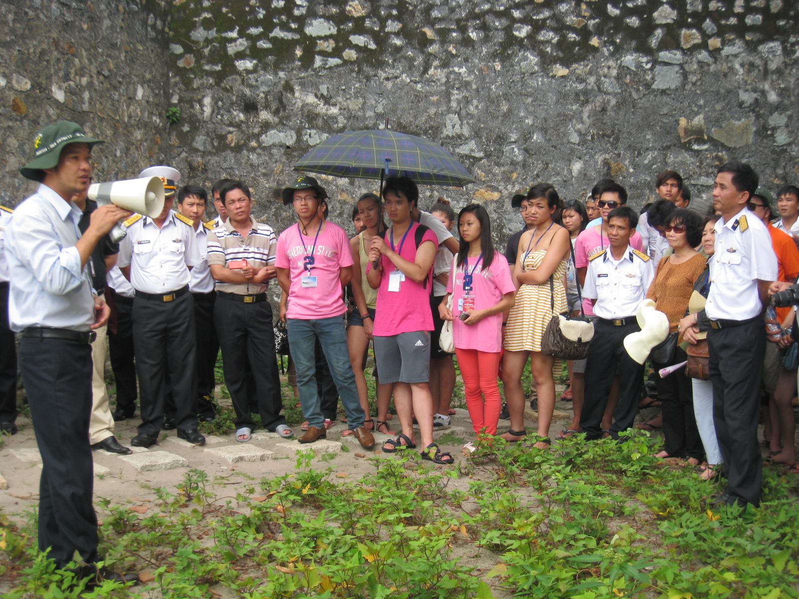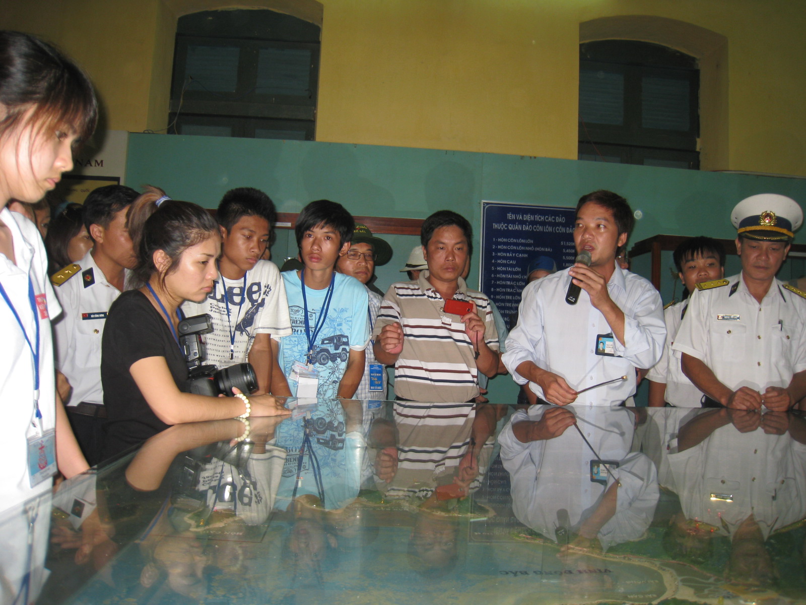 | Các thanh niên kiều bào lắng nghe hướng dẫn viên thuyết minh về nhà tù Côn Đảo |
