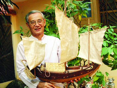 Tiến sĩ Nguyễn Nhã với chiếc ghe bầu mô hình mà các đội dân binh được triều đình cử đi quản lý khai thác Hoàng Sa thế kỷ 19. Ảnh: N.A.
