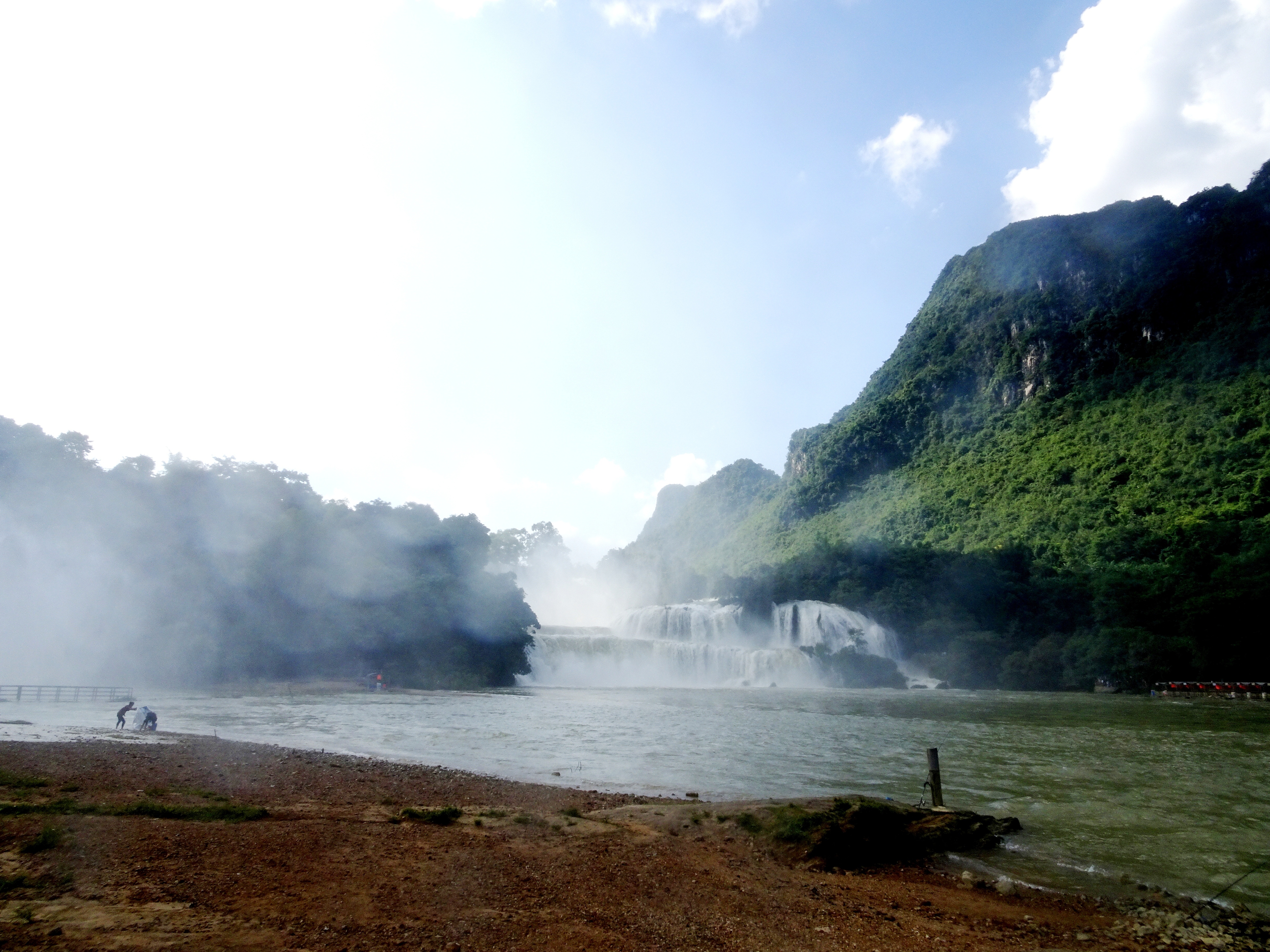 Rời Trà Lĩnh, qua tuyến đường đèo uốn lượn theo triền núi đá vôi, chúng tôi đến Trùng Khánh tham quan thác Bản Giốc - tuyệt tác thiên nhiên đã ưu ái ban tặng Cao Bằng. Đây là thác nước lớn thứ tư thế giới trong các thác nước nằm trên đường biên giới các quốc gia. Nằm sát đường biên giới Việt Trung, dòng sông Quây Sơn hiền hòa uốn lượn qua những cánh đồng lúa, rồi bất chợt đổ xuống thành thác từ độ cao khoảng 40 mét, qua nhiều bậc đá vôi tạo thành màn bụi nước trắng xóa, nhìn từ xa như những dải lụa trắng mềm mại. Ánh nắng mặt trời xuyên qua làn hơi nứơc tạo thành cầu vồng lung linh huyền ảo.