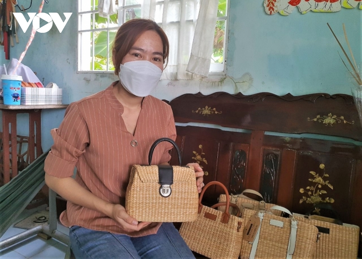 Chị Phạm Thị Hồng Nguyên bên những chiếc giỏ xách làm từ bồn bồn do chính mình làm ra. |