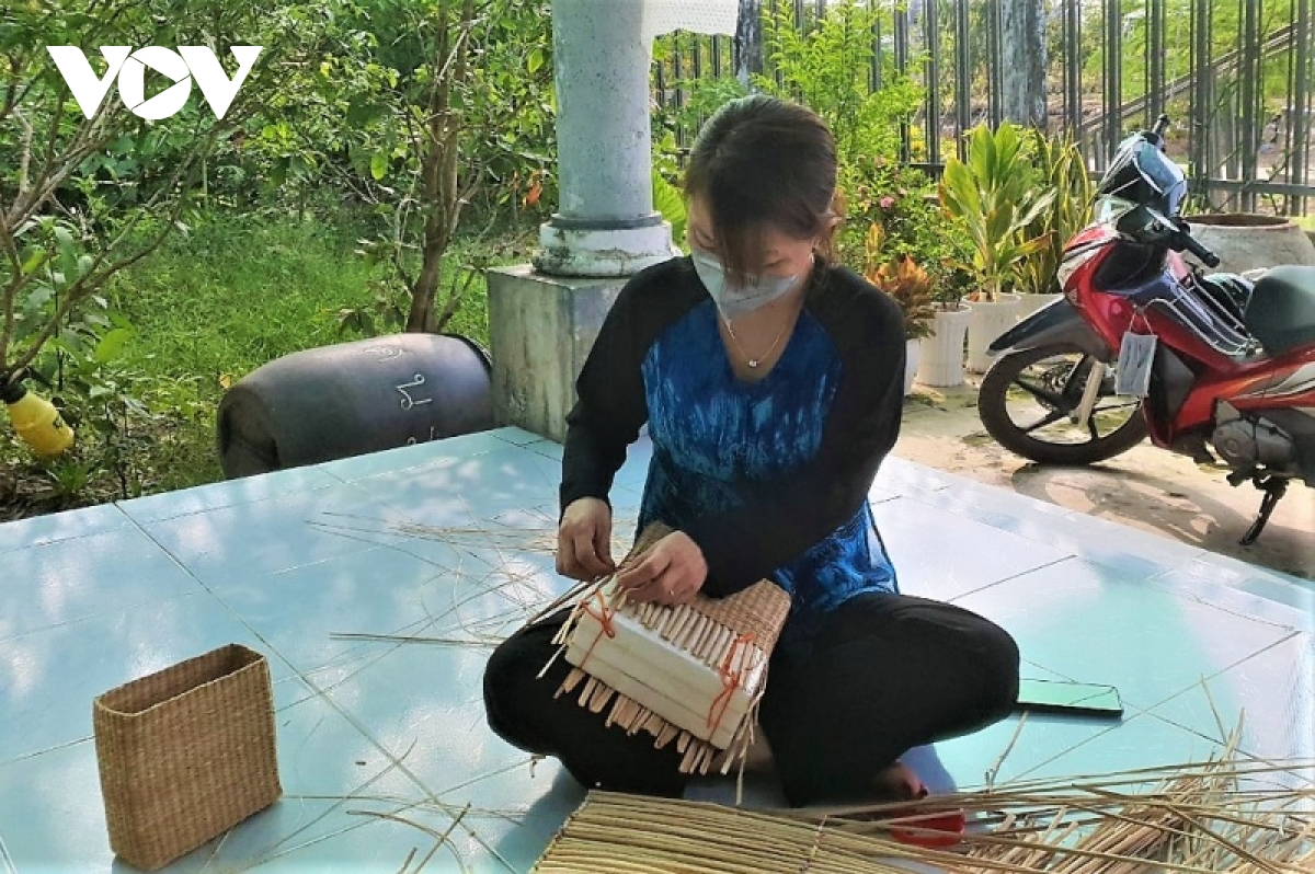 Nhiều người dân địa phương đã tìm đến học nghề đan túi bằng bồn bồn của chị Hồng Nguyên để kiếm thêm thu nhập |