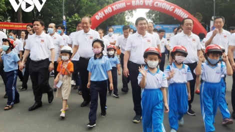 Phó Thủ tướng Thường trực Trương Hòa Bình đi bộ vận động toàn dân đội mũ bảo hiểm cho trẻ em