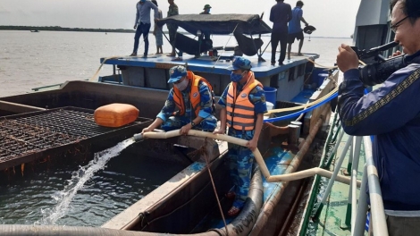(VOV5) - Các chiến sĩ đã chuyển nước ngọt xuống xà lan chuyển đến nhân dân xã Tân Thành, huyện Gò Công Đông, tỉnh Tiền Giang.