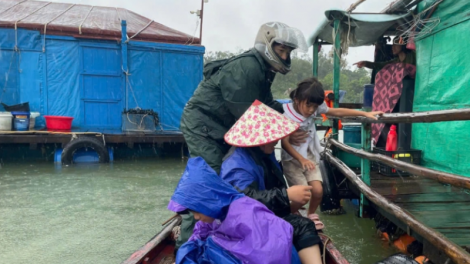 (VOV5) - Biên phòng, Công an, cán bộ thôn đang khẩn trương sơ tán người dân, đặc biệt ưu tiên đưa các em nhỏ, người già và phụ nữ từ các tàu thuyền lồng bè lên bờ an toàn.