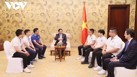 (VOV5) - Thủ tướng Phạm Minh Chính biểu dương nhóm sinh viên, đề nghị nhóm tiếp tục nghiên cứu, triển khai thương mại hóa sản phẩm bê tông xanh.