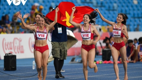(VOV5) - Nguyễn Thị Huyền, Nguyễn Thị Hằng, Nguyễn Thị Ngọc và Hoàng Thị Minh Hạnh mang về tấm HCV nội dung chạy tiếp sức 4x400m nữ cho điền kinh Việt Nam tại giải điền kinh châu Á 2023.