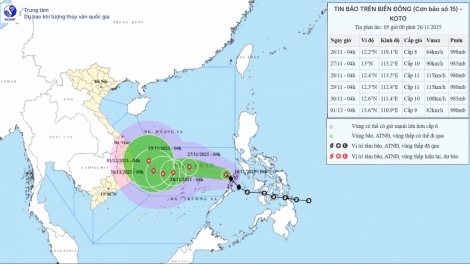(VOV5) - Lúc 4h ngày 26/11, vị trí tâm bão số 15 ở vào khoảng 12,2 độ Vĩ Bắc; 119,1 độ Kinh Đông, cách đảo Song Tử Tây khoảng 540km về phía Đông.