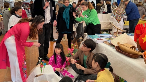 (VOV5) - Trung tâm Văn hoá Việt Nam tại Pháp đã giới thiệu một gian hàng trưng bày với các hình ảnh đặc trưng của Việt Nam, từ áo dài, nón lá cho đến trò chơi dân gian của trẻ em là nặn tò he.