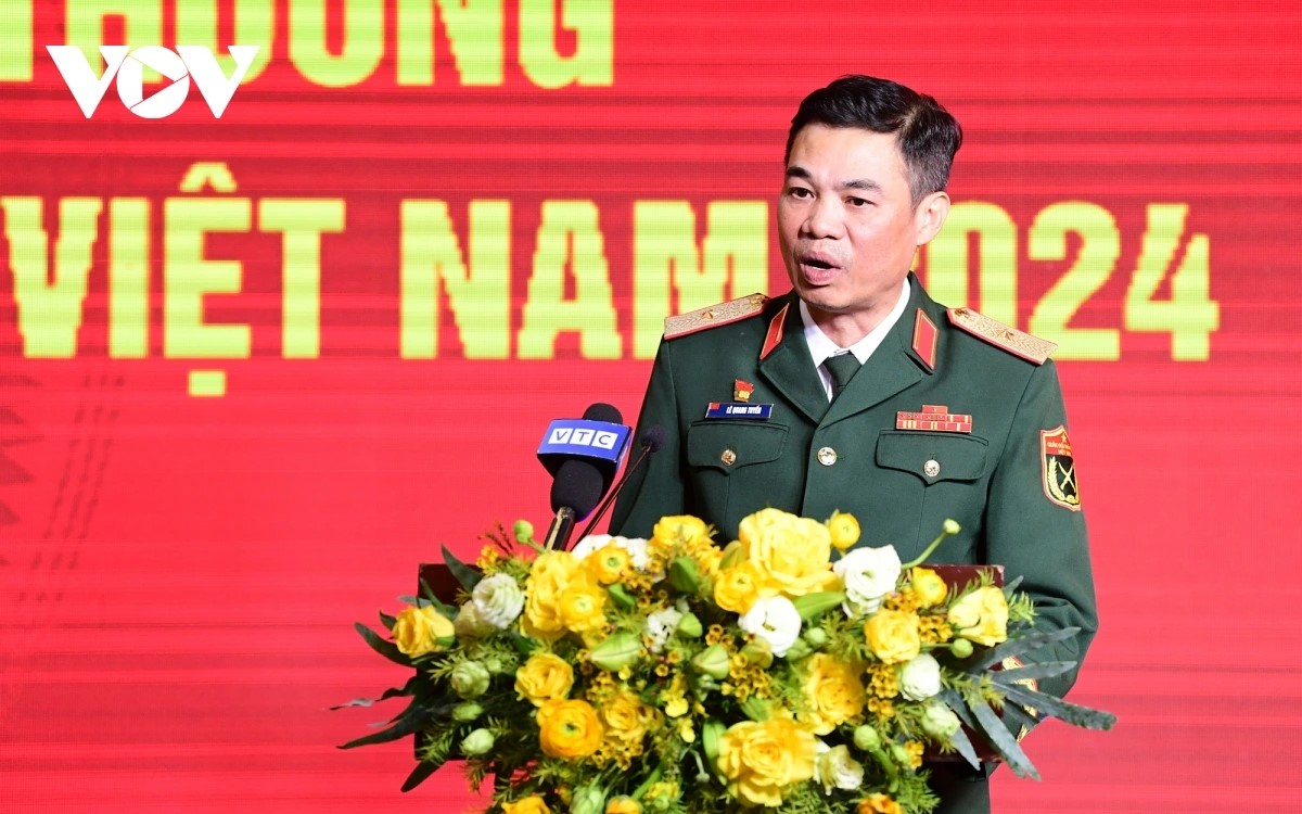 Thiếu tướng Lê Quang Tuyến, Phó Chủ nhiệm Tổng cục Công nghiệp quốc phòng, báo cáo tổng kết Triển lãm Quốc phòng quốc tế Việt Nam 2024. Ảnh: VOV |