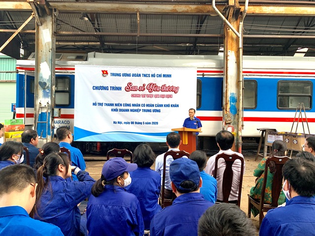 Sáng 8/5, Trung ương Đoàn tổ chức chương trình “San sẻ yêu thương, chung tay vượt qua đại dịch” hỗ trợ thanh niên công nhân đường sắt có hoàn cảnh khó khăn do dịch bệnh Covid -19 tại phân xưởng đầu máy toa xe Hà Nội thuộc Tổng Công ty Đường sắt Việt Nam.