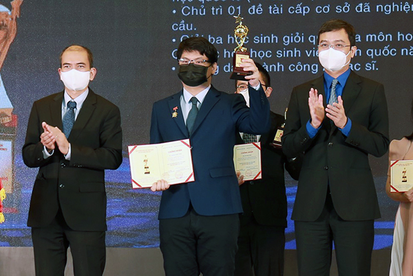 Anh Bùi Quang Huy, Bí thư Thường trực TƯ Đoàn (bìa phải) chúc mừng tài năng trẻ xuất sắc đạt Giải thưởng KHCN Quả Cầu Vàng |